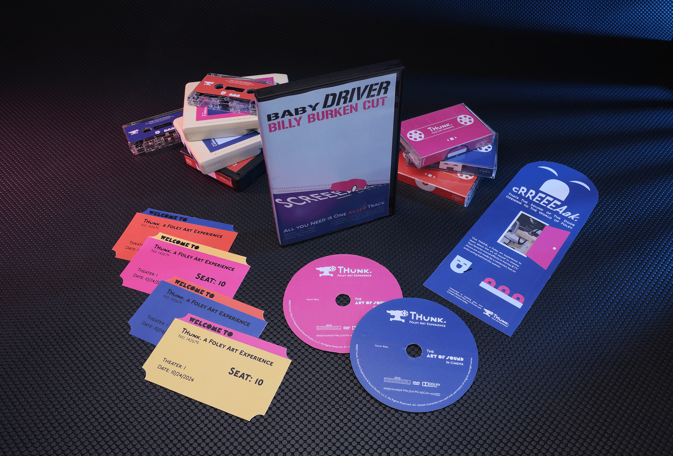 THUNK. is a studio where people can experience the process of creating Foley, the art of sound in cinema. The rain pouring down onto a couple in movie is actually an artist cooking bacon into a microphone. Weird objects like this are used to record each sound that goes into the final cut. Patrons get to see how Foley works, learn the history, the process, and then dub over the sound of their favorite films. Afterwards, they get to sit down and watch the recorded clips and customize a package for their very own Foley reel!
